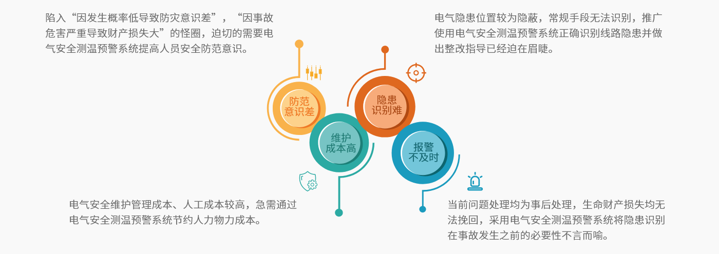 基于云計算、物聯網、大數據、AI、自取電、超級功耗等新一代信息技術,對電氣線路和用電設備進行不間斷的測量,輔助監測電氣設備溫度,實時發現電氣線路和用電設備存在的異常啟停、安全隱患等現象,并對引發電氣火災隱患進行預警、分析,一旦發現異常,可即時向安全管理人員發送預警信息,指導其開展隱患治理,達到消除潛在的消防安全危險,實現“防患于未然”的目的。